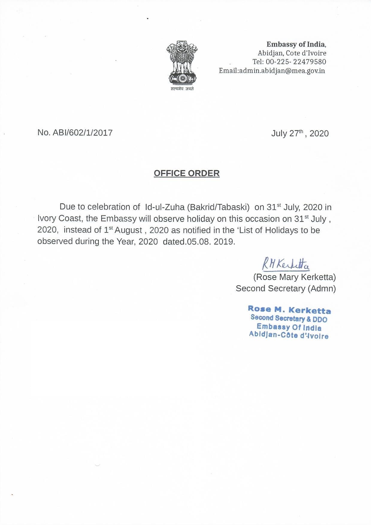 Holiday at Embassy on the occasion of Id-ul-Zuha (Bakrid/Tabaski).