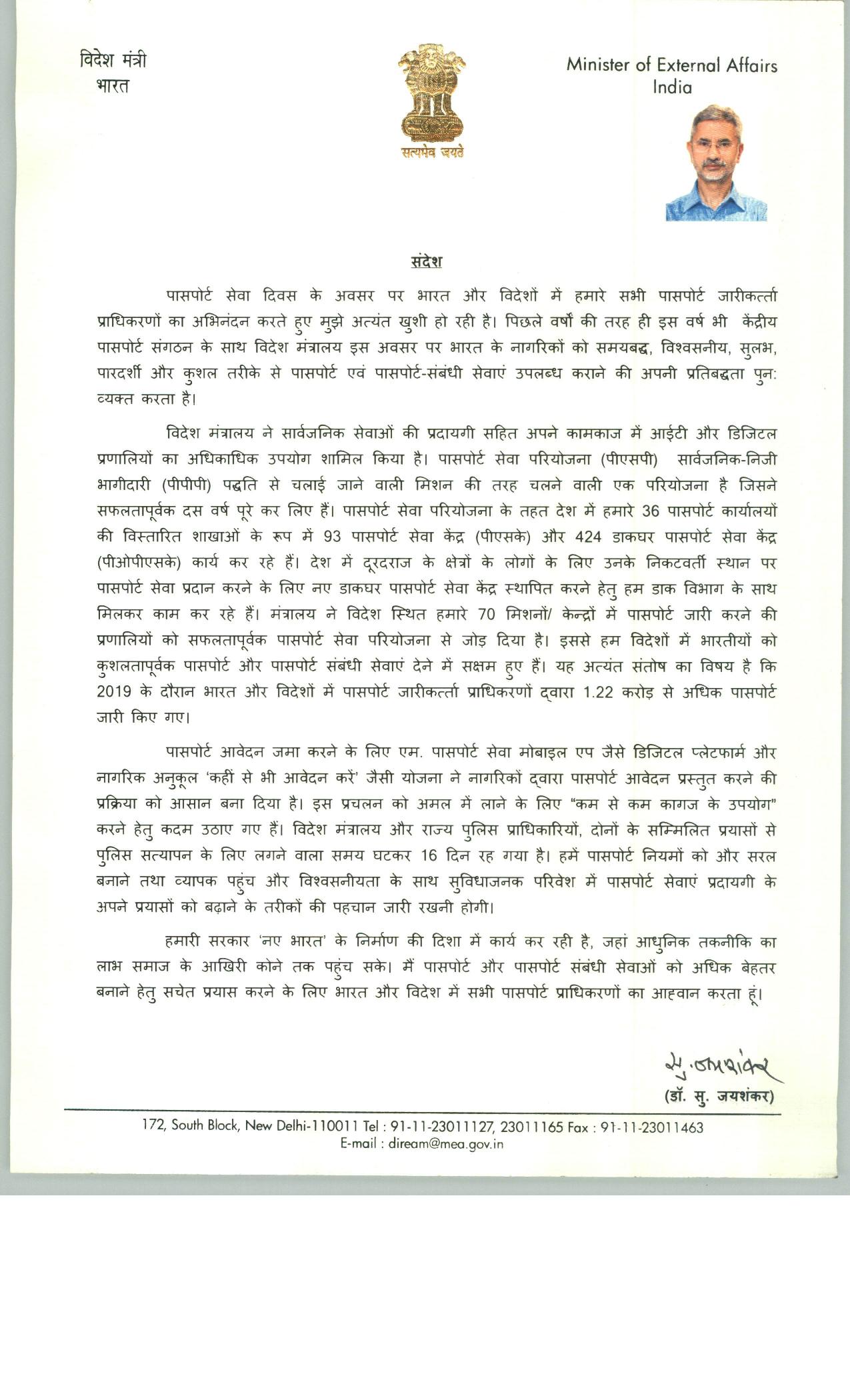 Message from the Hon'ble EAM Dr. S. Jaishankar on the occasion of Passport Seva Divas on 24 June 2020.