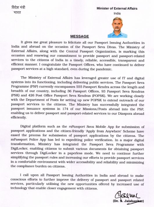 The message of External Affairs Minister, Dr. S. Jaishankar on the occasion of the #PassportSevaDivas tomorrow i.e. 24 June, 2021.
