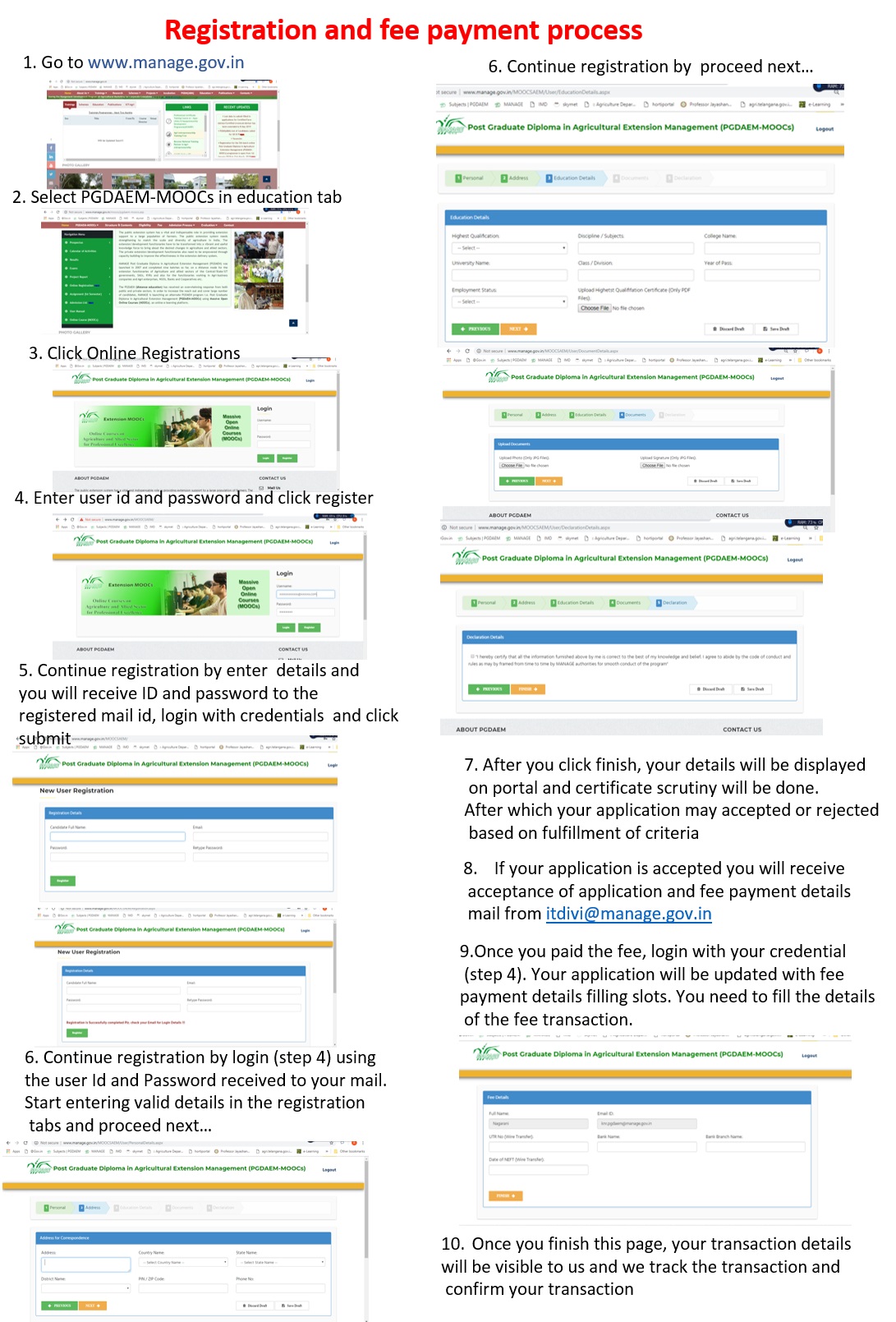 National Institute of Agricultural Extension Management (MANAGE), Hyderabad operating under the aegis of the Ministry of Agriculture & Farmers Welfare, Government of India invites applications for admission in two online courses in Agricultural Extension Management (PGDAEM) and Agri-warehousing Management (PGDAWM). Both the courses, PGDAEM & PGDAWM are of one year duration and offered online through MOOCs platform.