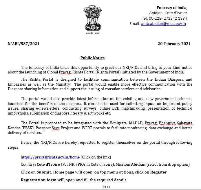 Public Notice: Launching of Global Pravasi Rishta Portal (Rishta Portal)