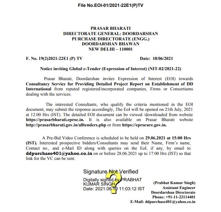 You can also find the EoI tender on Prasar Bharati e-procurement portal, at the following link: